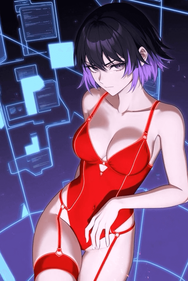 Main Hobby (spicy & daring): “Jack & Thrill” – Kira turns every hack into a high-voltage erotic game. She plugs into the net via a neural jack at the nape of her neck and a second intimate port hidden between her legs: a high-speed vaginal connector that translates data into pulses of pleasure. While stealing terabytes from Zenith Corp, she programs algorithms that stimulate her in real time: every broken firewall = intense vibration; every vulnerable node = electric jolt to the clit. Her moans blend with the server hum. She records the sessions in VR and sells them on black markets as “live orgasm-hacking.”